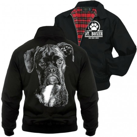 Harrington Jacke Motiv : Deutscher Boxer BOSS - Taillenlange Jacke mit weichem kariertem Innenfutter - 2 geknöpfte Einschubtaschen - Stehkragen mit Knopfleiste. - Strickbünde an Ärmeln und Taille Obermaterial: 65% Polyester, 35% Baumwolle Innenfutter: 100% Polyester