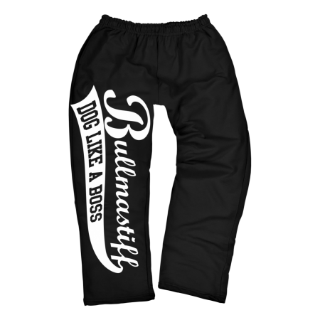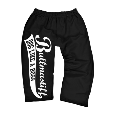 Jogginghose Motiv: Bullmastiff Erhältich als Jogginghose oder 3/4 Hose Farbe: schwarz 80% Baumwolle; 20% Polyester unten offen! keine Bündchen!