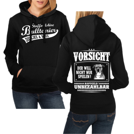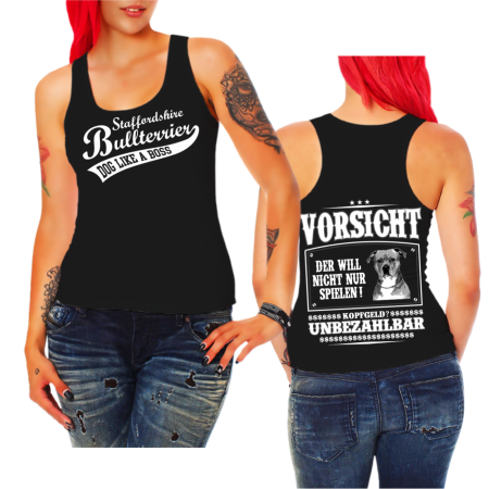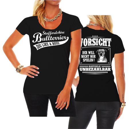 T- Shirt Motiv: Staffordshire Bullterrier VORSICHT ! Textildruck im hochwertigen Siebdruckverfahren hergestellt. auch erhältlich als: T- Shirt, Trägershirt, Sweatshirt oder Kapuzensweatshirt Grössen: M, L, XL, S und XXL
