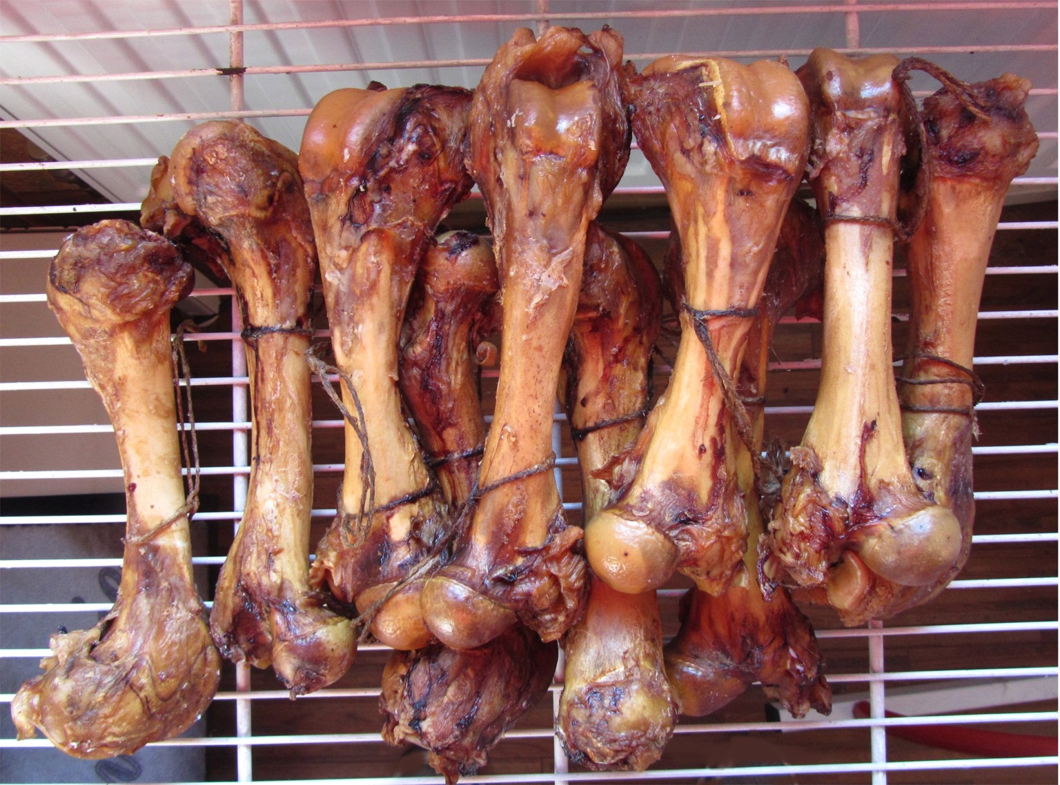 Sie erhalten 1 Stück Schinken-Knochen vom Schwein ( mit Knorpel, Knochen, und Fleischanteil) ca 22 cm lang.