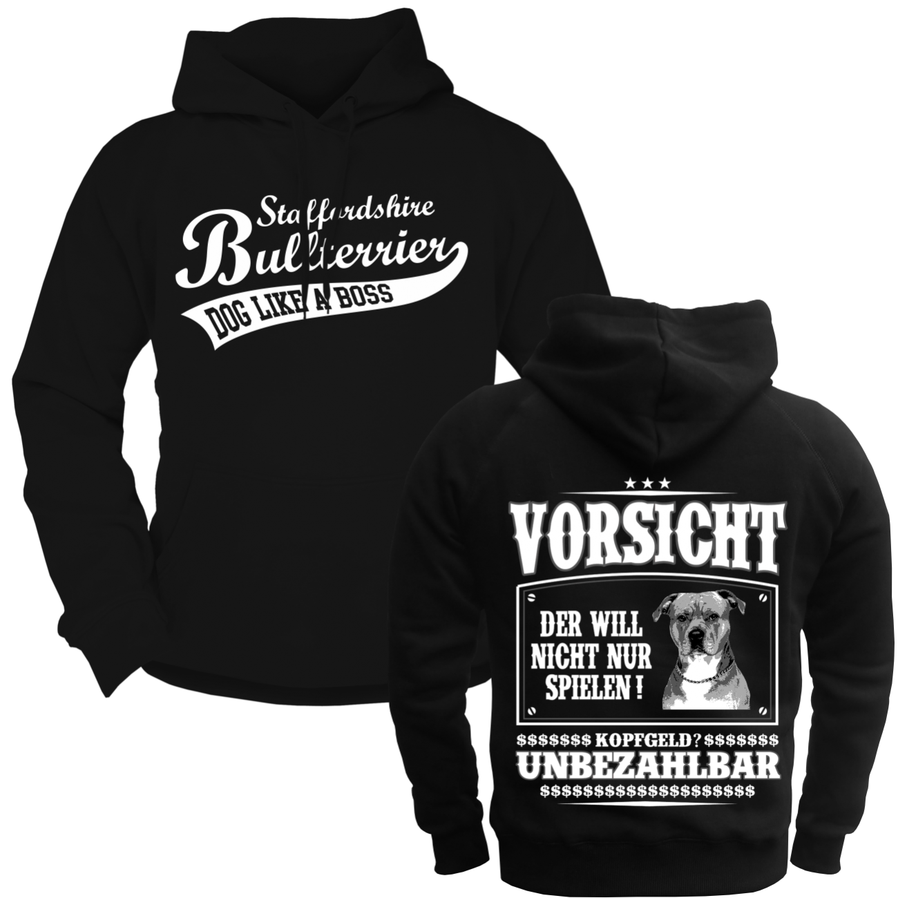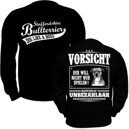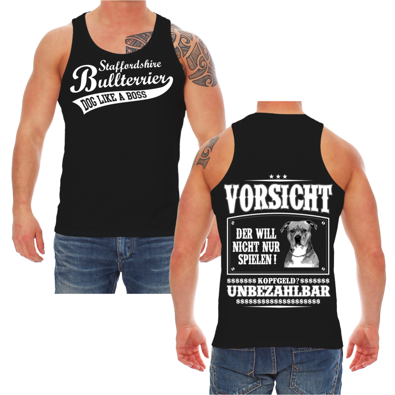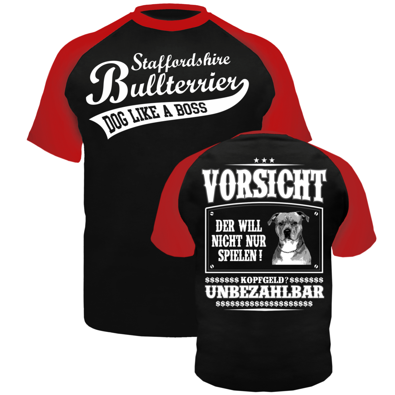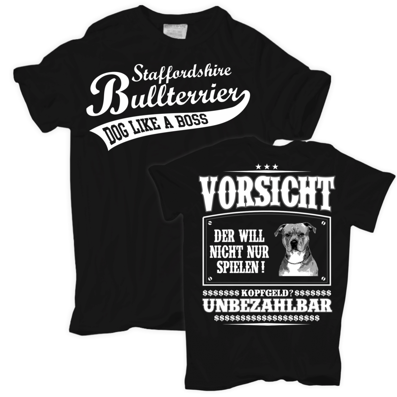 T- Shirt Motiv: Staffordshire Bullterrier Vorsicht Textildruck im hochwertigen Siebdruckverfahren hergestellt. auch erhältlich als: T- Shirt, Trägershirt, Sweatshirt oder Kapuzensweatshirt Grössen: S, M, L, XL, XXL, XXXL, XXXXL und XXXXXL