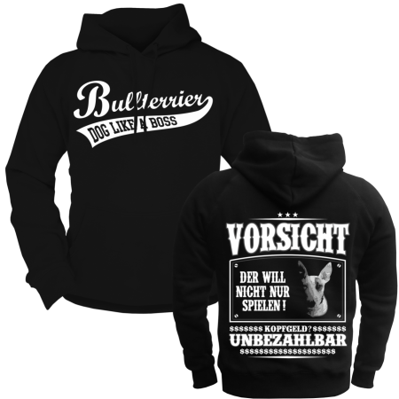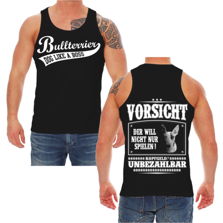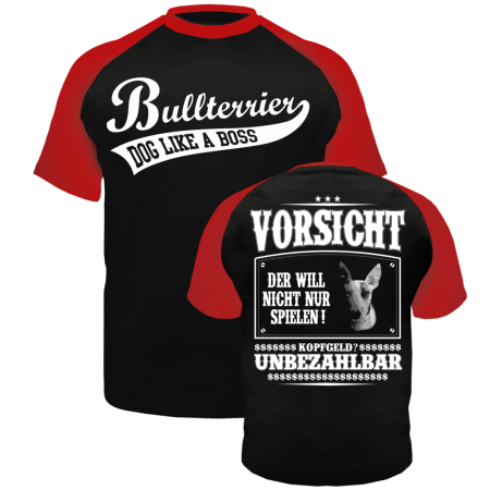 T- Shirt Motiv: Bullterrier VORSICHT Textildruck im hochwertigen Siebdruckverfahren hergestellt. auch erhältlich als: T- Shirt, Trägershirt, Sweatshirt oder Kapuzensweatshirt Grössen: S, M, L, XL, XXL, XXXL, XXXXL und XXXXXL