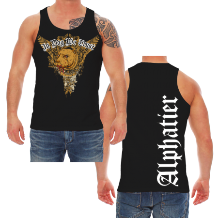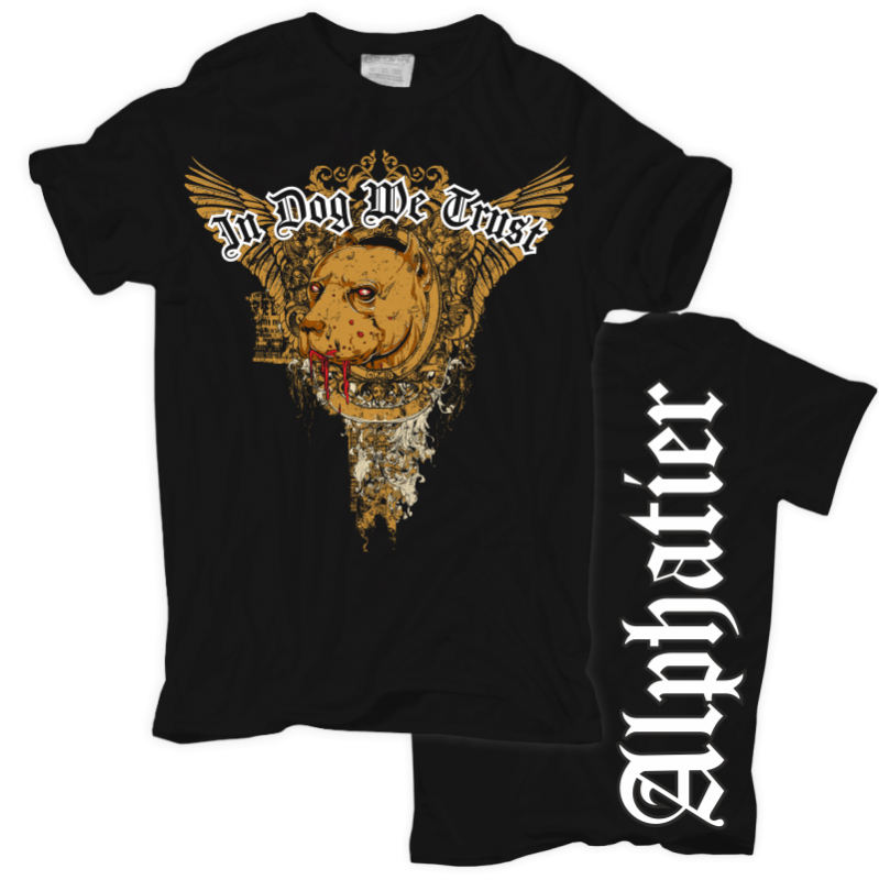 T- Shirt Motiv: In Dog We Trust - Alphatier Textildruck im hochwertigen Siebdruckverfahren hergestellt. auch erhältlich als: T- Shirt, Trägershirt, Sweatshirt oder Kapuzensweatshirt Grössen: S, M, L, XL, XXL, XXXL, XXXXL und XXXXXL