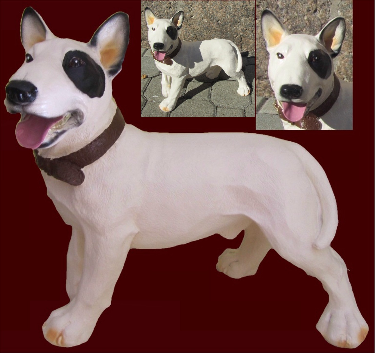 Bullterrier Figur, weiss mit Monokel, Stehend aus Kunststein