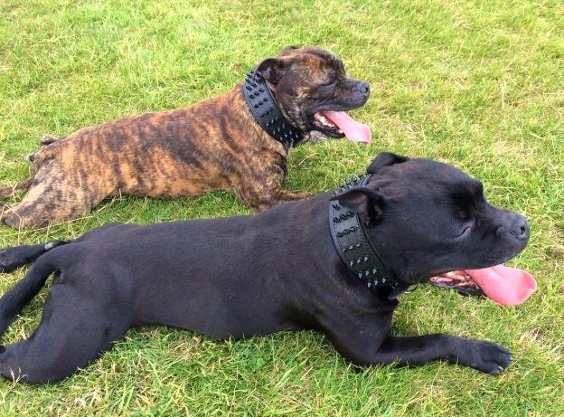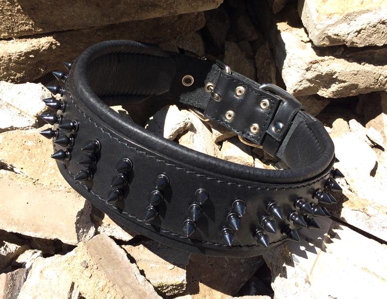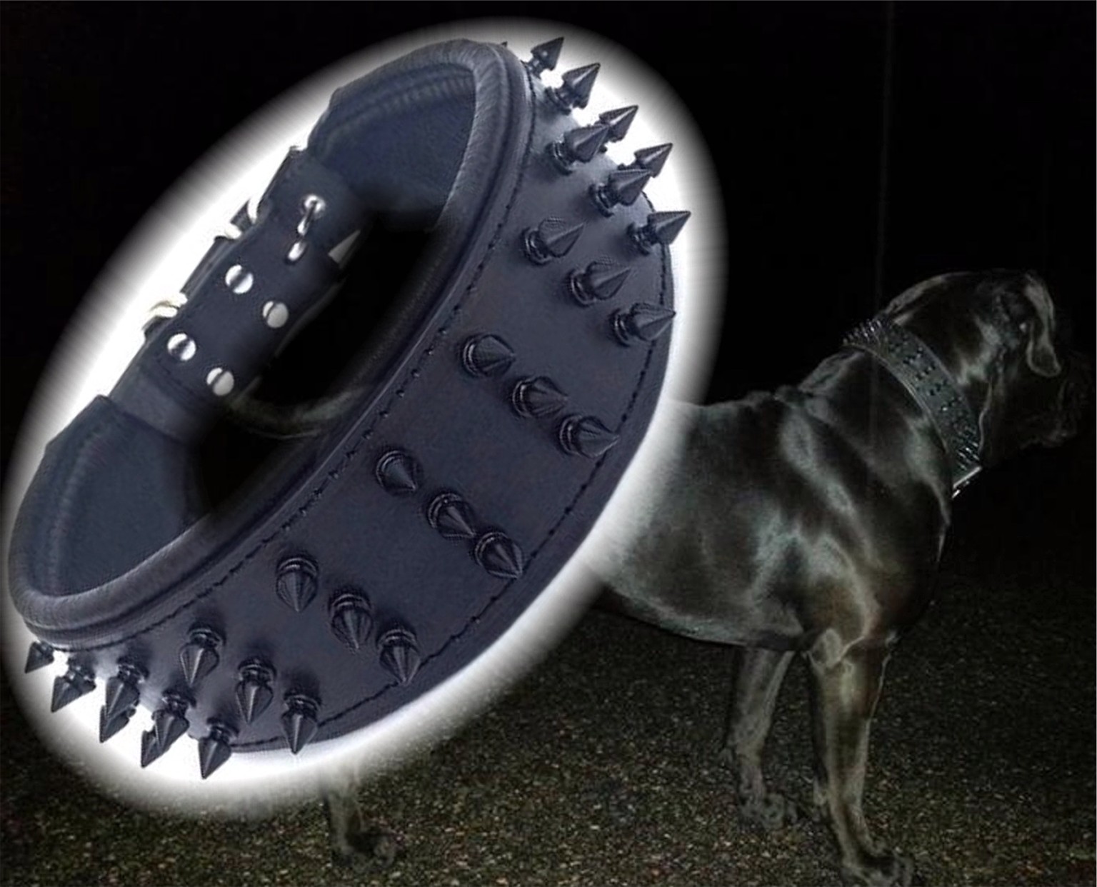 Der "Goldene Riese" ist ein klassisches Nietenhalsband mit 12 mm langen, schwarzen Schraubspitzen.