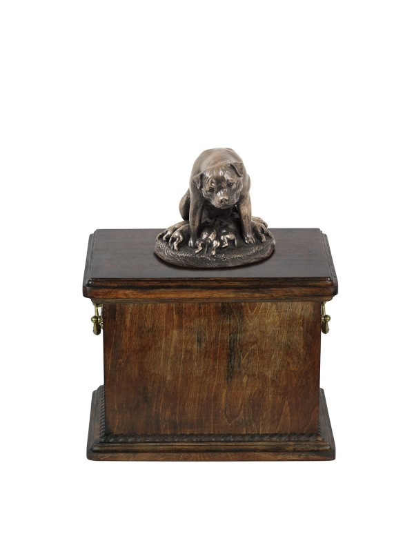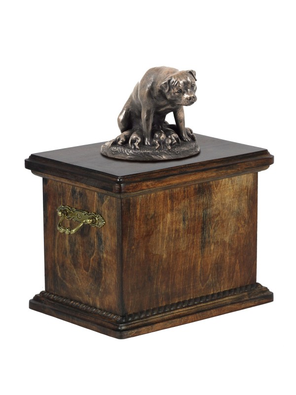 Bestattungsurne hat Messinggriffe und Verzierungen im Kranzstil.